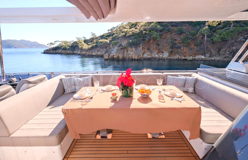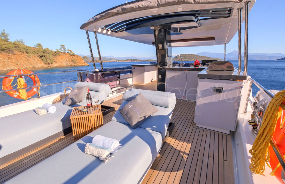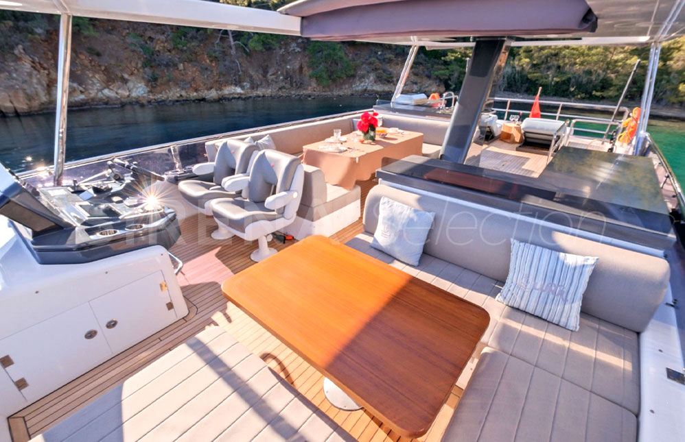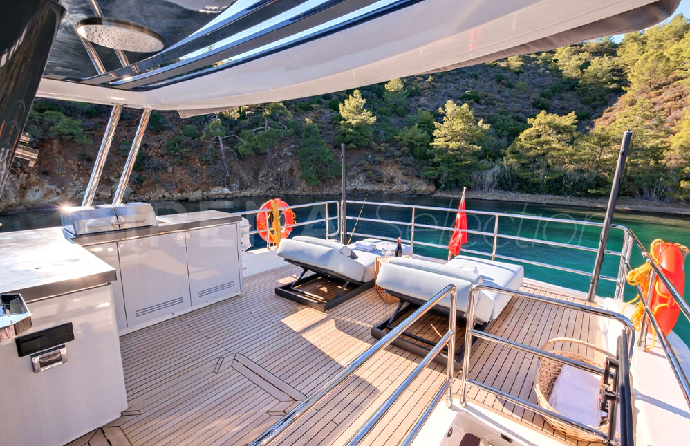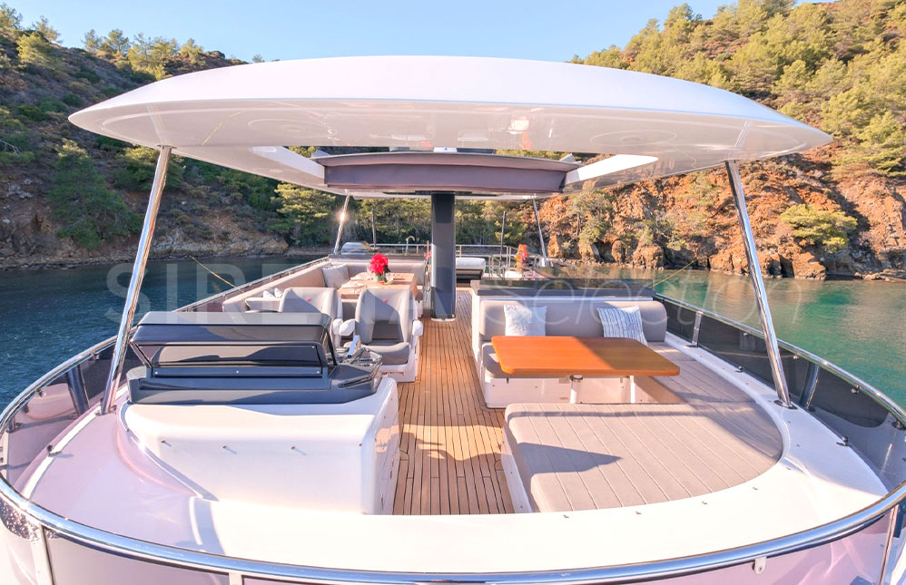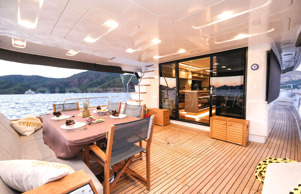 - Kıç havuzluk ve ön güverte koltukları, güneşlenme minderleri ve masalar için koruma kapamaları