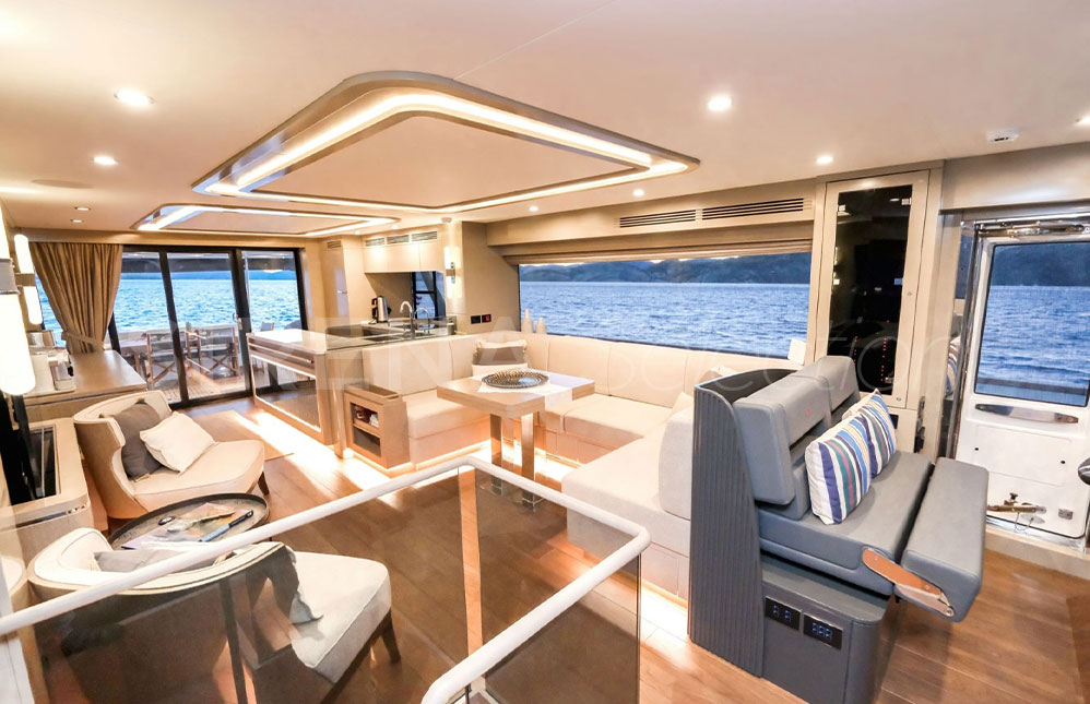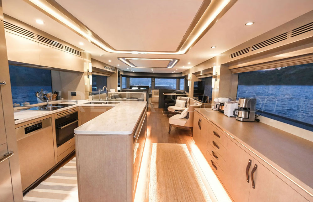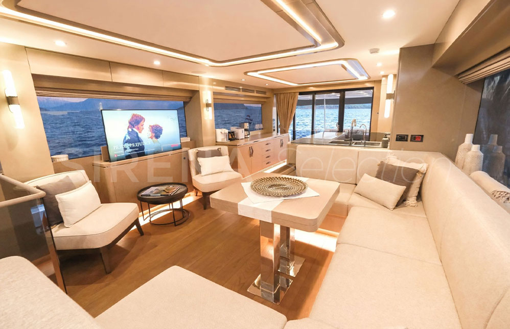 - Salon Yerleşimi Alternatifi Salon girişi iskelede mutfak ve genişletilmiş mutfak tezgahı karşısında ahşap dolap. İskelede U-şekilde oturma grubu ve katlanabilir sabit yemek masası. Sancakta 2 berjer ve sehpa, arkasına opsiyonel hi-lo TV mekanizması ve ünitesi