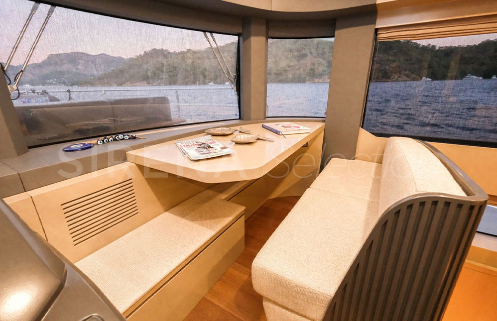 - Flybridge iskele baş oturma grubu için manuel iner-kalkar masa (güneşlenme alanına dönüştürülebilir)