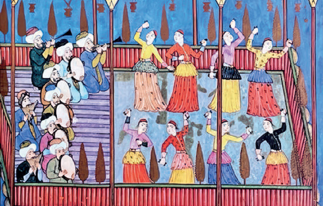 The branch of traditional Turkish art in which the approach to painting comes to the fore is undoubtedly miniature painting. This type of painting, in which perspective is ignored, is based on neat work and is intertwined with the art of calligraphy. Since calligraphers generally do not need to paint, miniature has remained a separate specialty. This branch of art, which is also seen in Iranian art, often depicts historical events and figures, so many miniatures related to seafaring can be found. For example, you can see this on the imperial barge Sultan Osman boarded to go to the newly built palace in Levni’s work Surname, created in 1690. In another miniature in the Topkapı Palace Museum, the sultan is depicted watching a festive scene set up on a raft. On this scene floating in the sea, dancer boys dressed in women’s clothes are dancing.